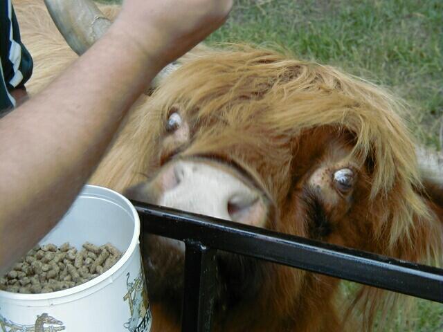 petting zoo area. The area around the barns and petting zoo had some beautiful rock gardens with some odd looking plants, flowering cactus, and a butterfly having lunch on some verbena. Also a very nice goldfish pond. Now we are off on the wagon ride through the safari and pastureland. The animals will come up to your car or the wagon to be fed. I am sorry I cannot remember the names of all the elands, deer, and bison varieties we saw. Some would stick their heads right through the rails or the open area in the back to get their food. While some of them look rather vicious, they are all very friendly and take the food very gently from your hands. The deer were very lovely but were afraid to come close to the wagon. However, the little horned guy has learned to keep to front paws on the wagon and walk along behind while eating. In the picture with the guys shoe he is going after food not him. The baby zebra was born last week. This last picture of the pot bellied pig babies is blurry but it is the best one I could get.